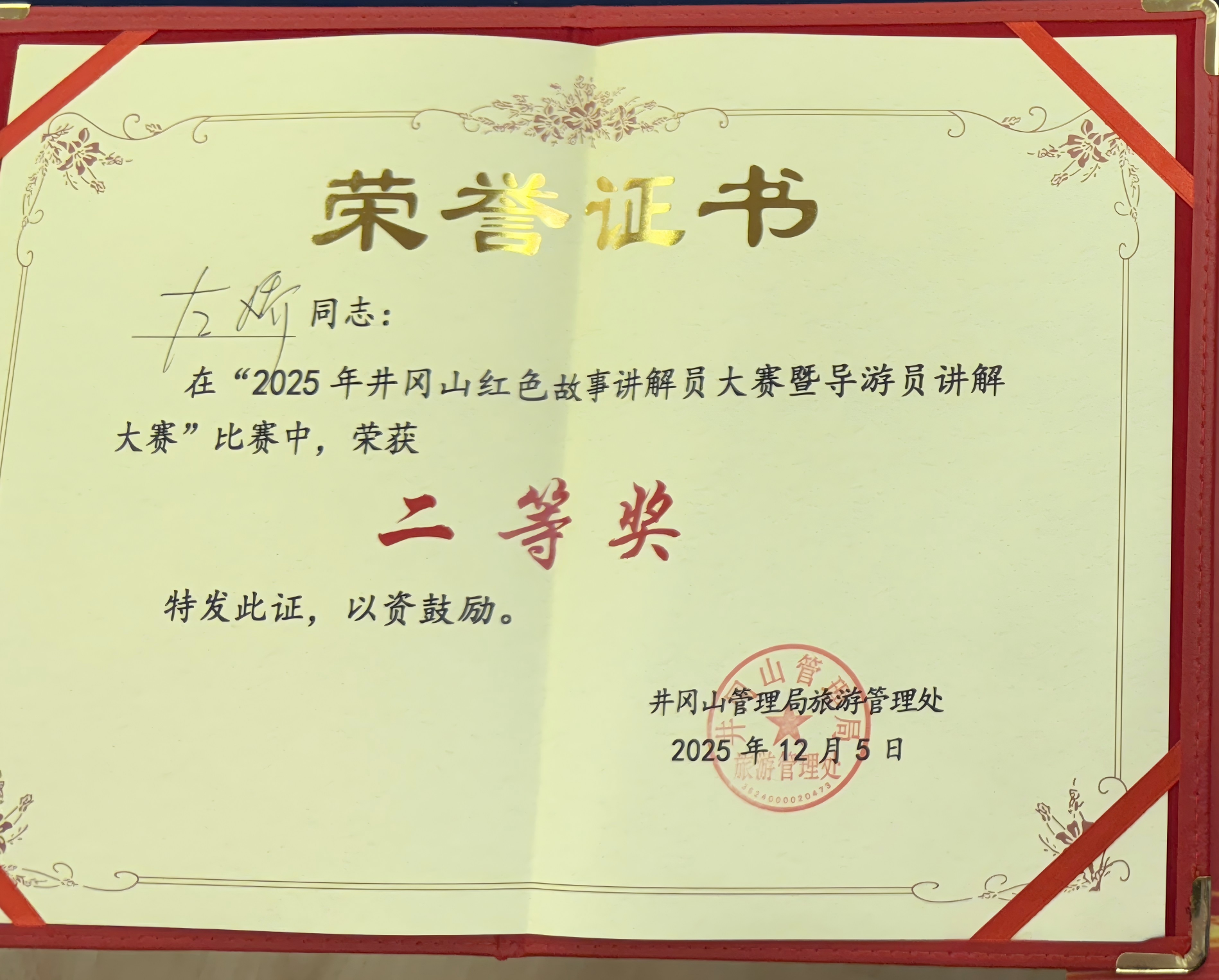 近日,2025 年井冈山红色故事讲解员大赛暨导游员讲解大赛成功举办。我校带班组织员左娇同志凭借扎实的专业素养、生动的讲解表现,在全市 31 名优秀参赛选手中脱颖而出,成功斩获大赛二等奖!